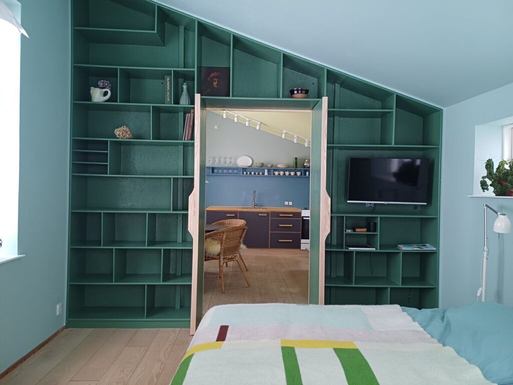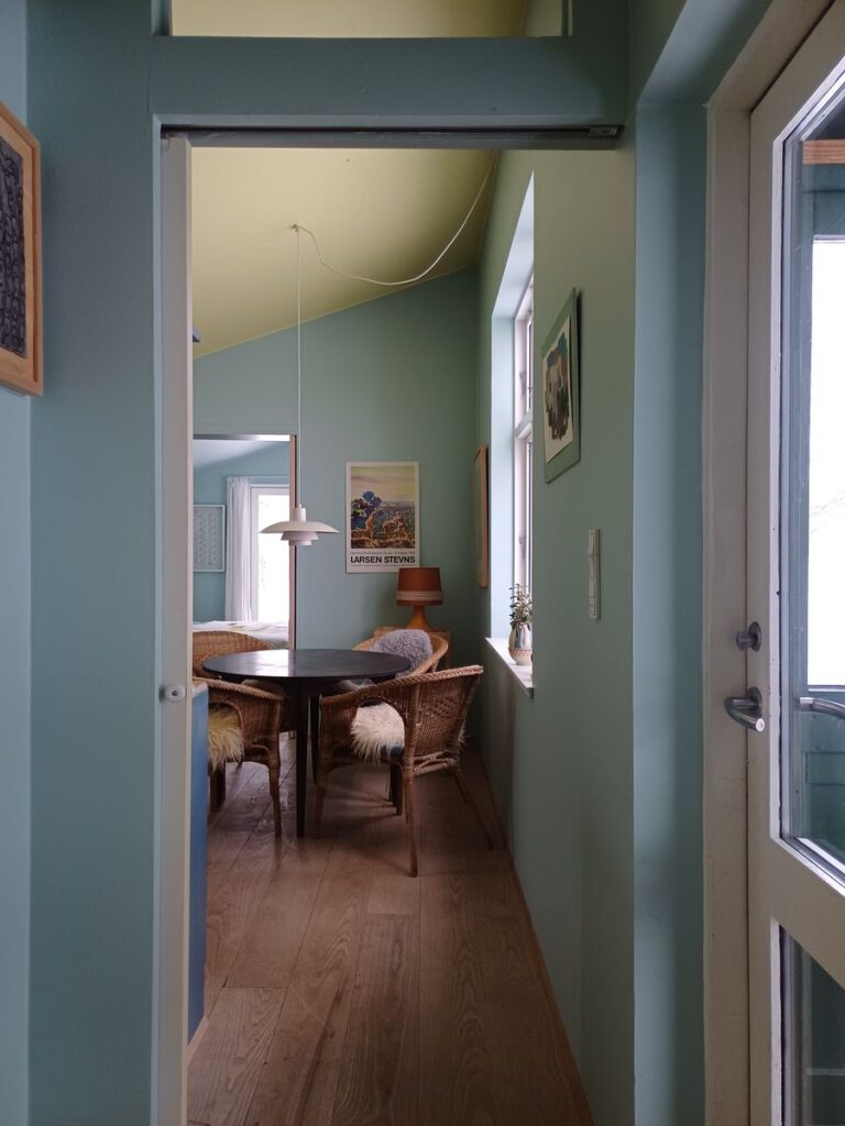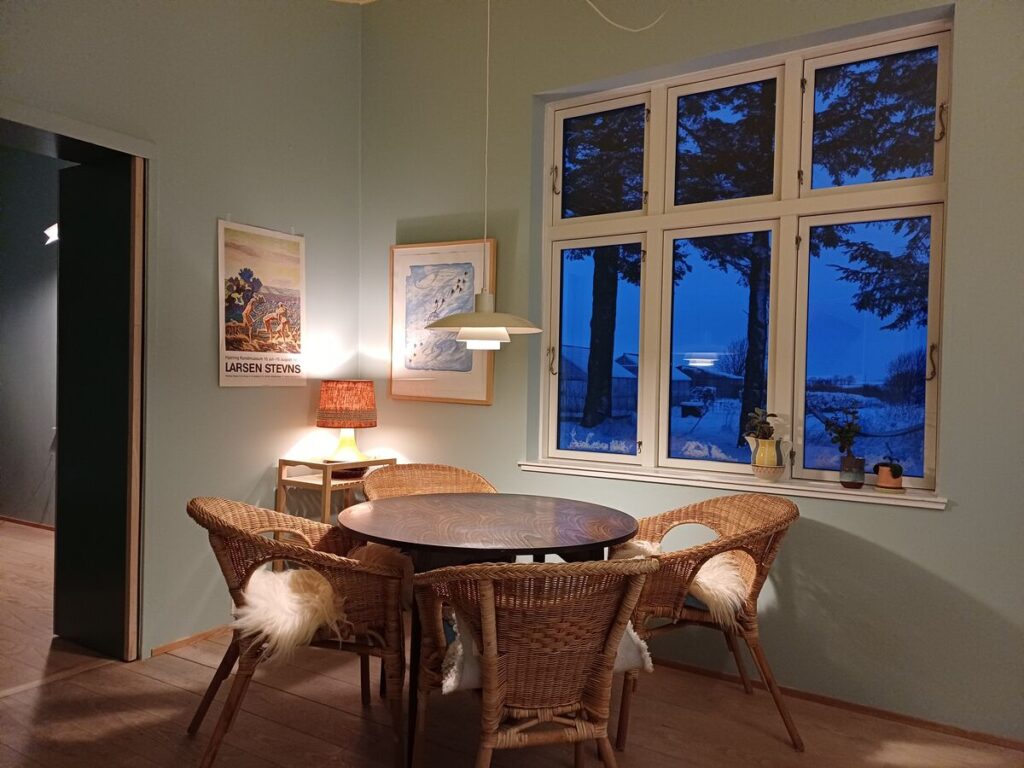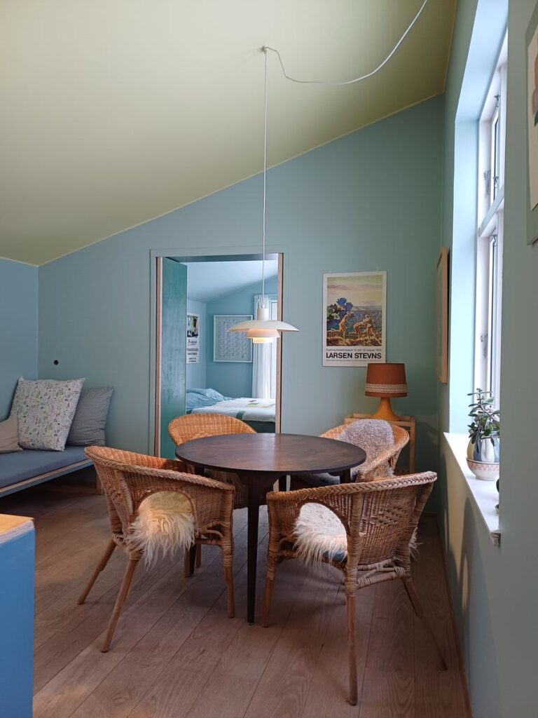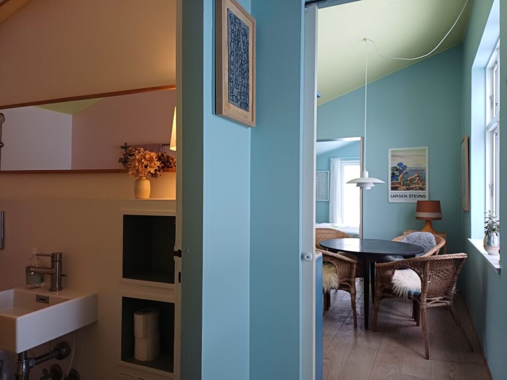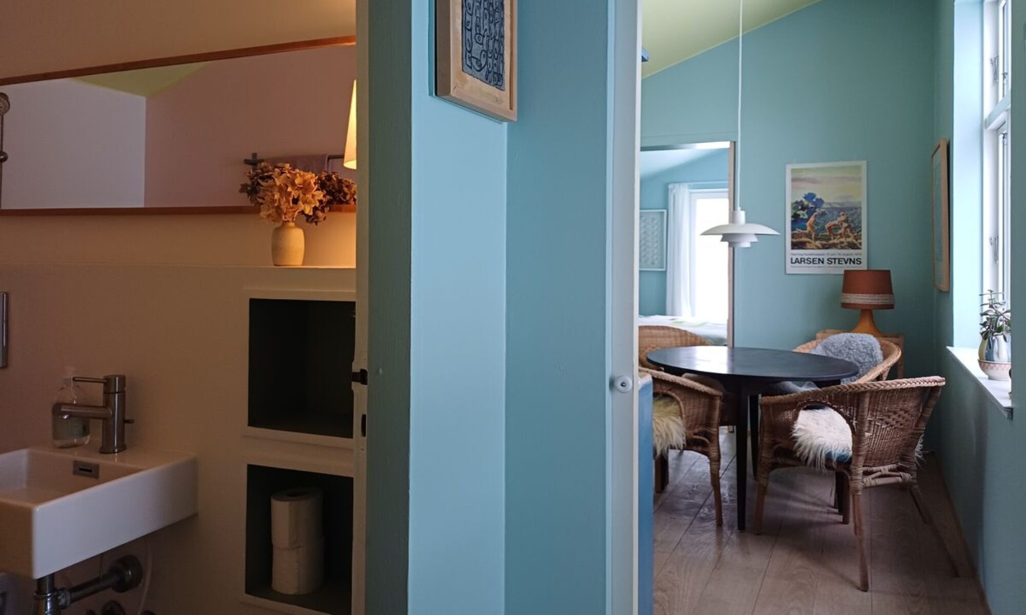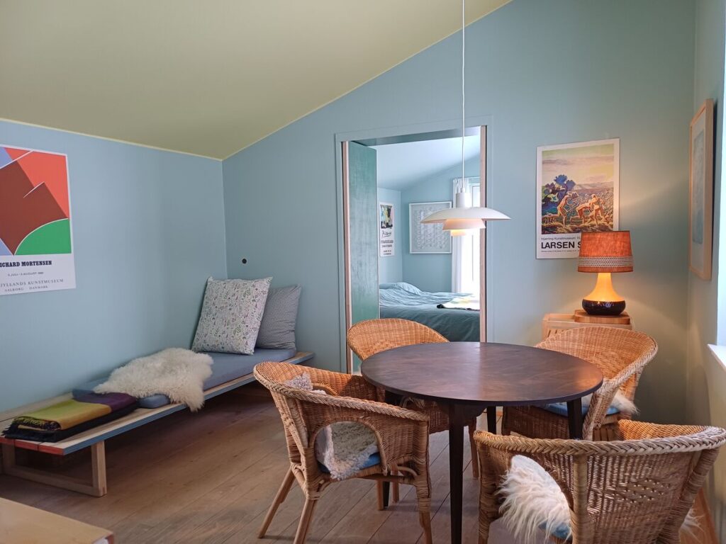 Huset er 56 m stort og ligger for sig selv, nord for stuehuset, med udsigt over marken og køkkenhaven. Det er indrettet med to gode værelser, eget bad/ toilet, stue og køkken.
