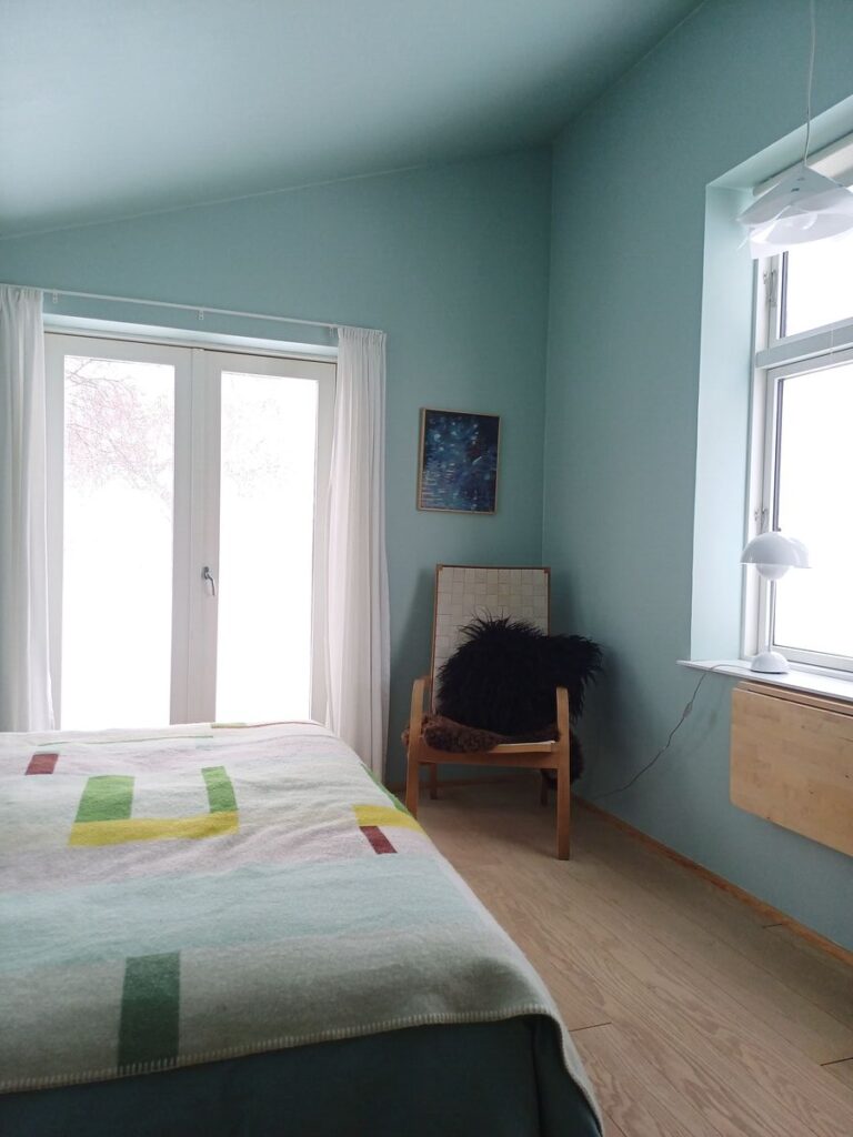 Vestværelset med dobbeltseng og flot udsigt til haven. Der kan evt. redes op med to enkeltsenge. Husets TV er her.