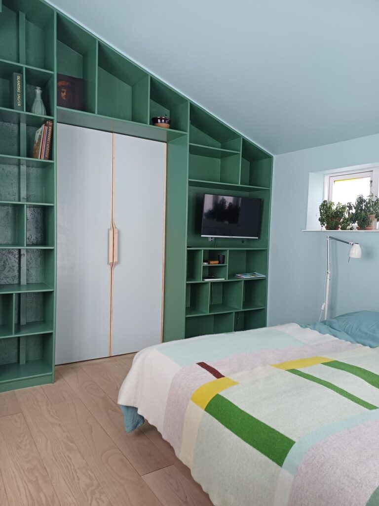 Østværelset med en trekvartseng, stort skab og arbejdsbord.