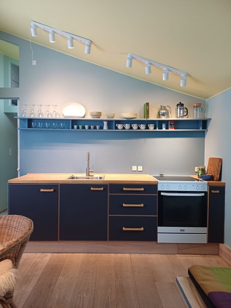 Køkkenet er indrettet med komfur, køleskab og almindeligt husgeråd.